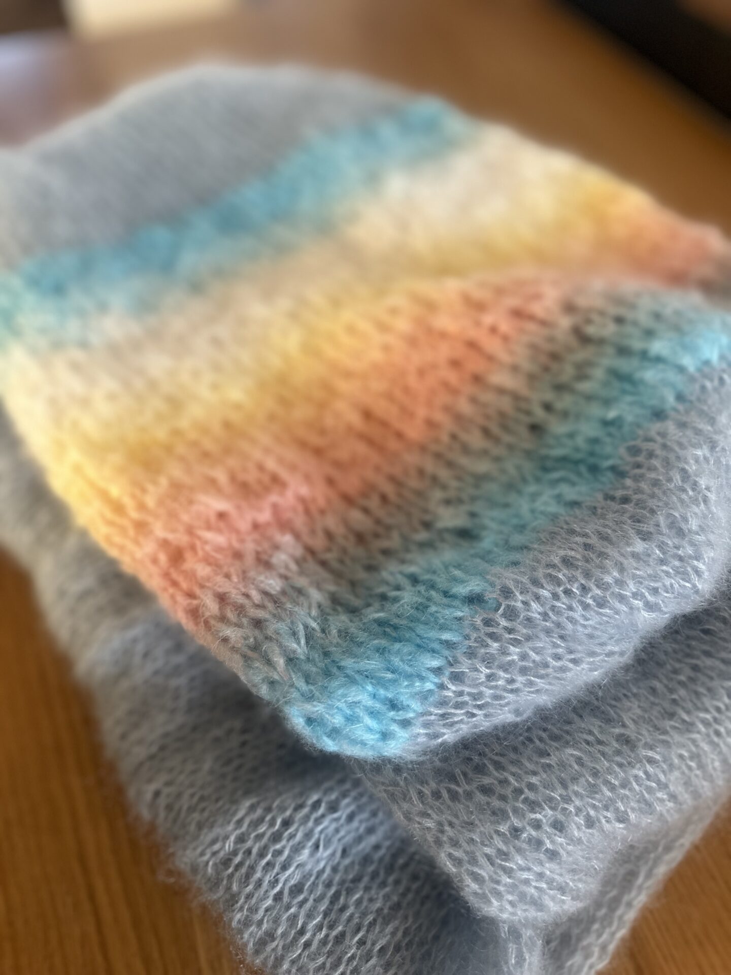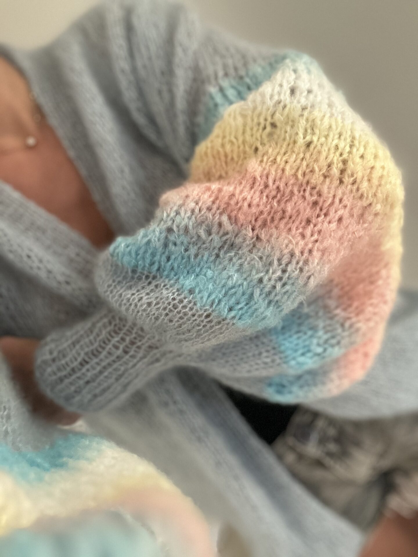 Ręcznie robiony kardigan to MUST HAVE. Sweter o luźnym kroju. Wykonany z delikatnej puszystej przędzy. Szerokie, kolorowe rękawy są ozdobą tego fasonu. Wykonany jest z mieszanki przędzy moheru i jedwabiu najwyższej jakości. Stanowi dopełnienie stylizacji, idealny dospodni, sukienek czy szortów. Miękki, ciepły, przyjemny w dotyku. Wykonany został w jednym egzemplarzu. Nie ma Powtarzalności kolorystycznej.