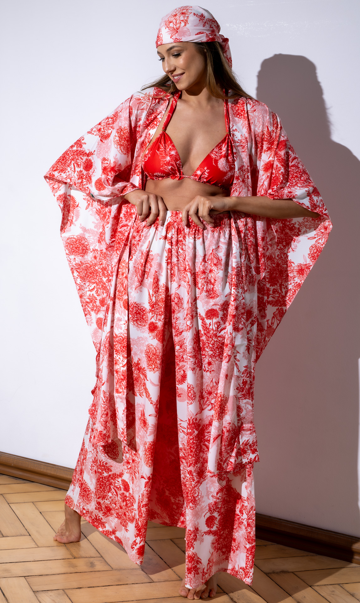 Zwiewne kimono plażowe Flower to połączenie elegancji, oryginalności i komfortu. Doskonale sprawdzi się jako okrycie na bikini czy strój kąpielowy. Kimono o kroju oversize, z asymetrycznym dołem uszyte zostało z wysokiej jakości szyfonu. Eteryczne i przewiewne. Idealnie sprawdzi się w plażowych ale również streetwearowych stylizacjach. W połączeniu ze spodniami plażowymi Flower tworzy luksusowy, resortowy look. W zestawie pasek.