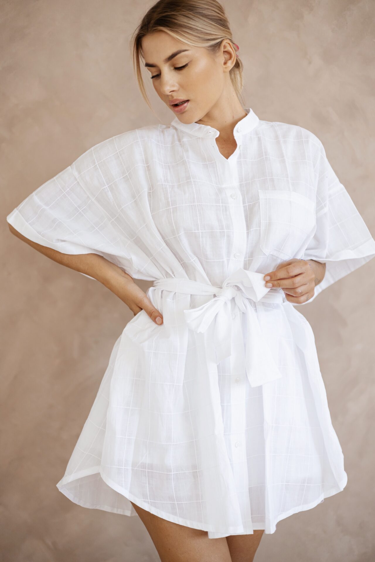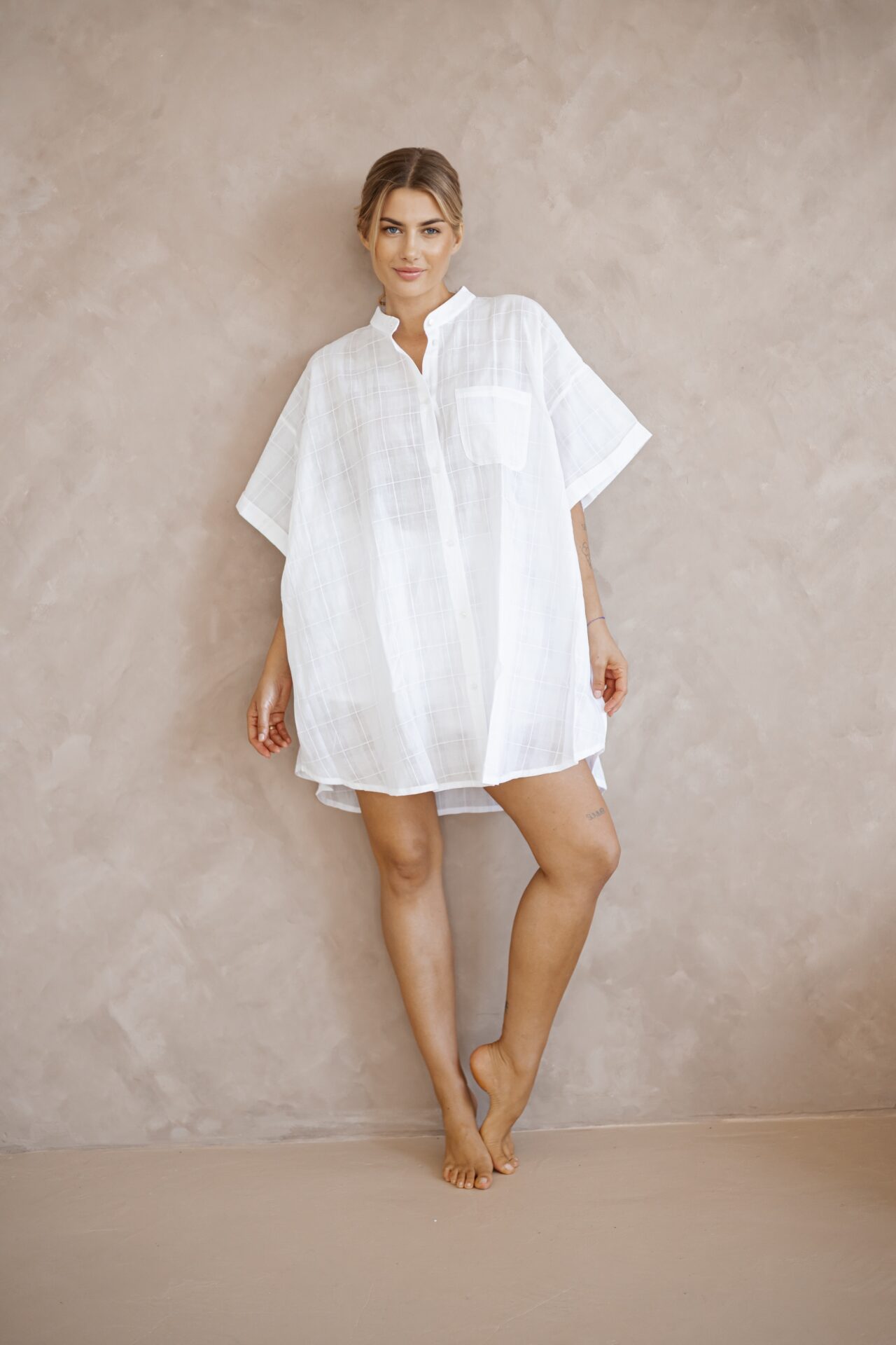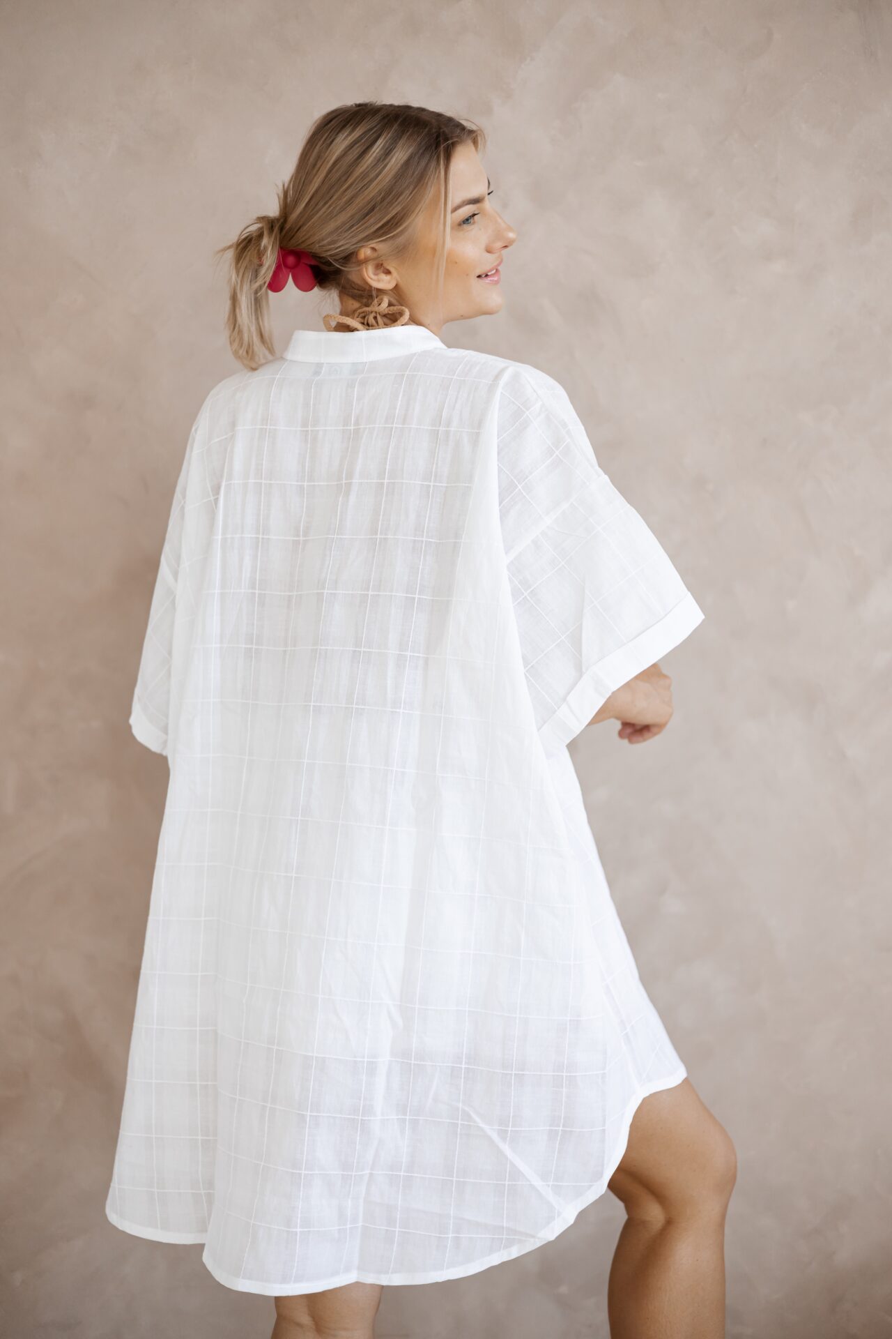 Nusa to komplet składający się z  tuniki o kroju koszuli oversize oraz krótkich spodenek. Set wykonany został z delikatnej i cieniutkiej bawełny. To klasyka kroju i koloru ponadczasowej bieli. Luźny fason, niesamowita tkanina, przewiewność i wygoda, to główne cechy kompletu Nusa, który sprawdzi się zarówno w eleganckich jak i luźnych, plażowych oraz sportowych stylizacjach. Dzięki dodatkowemu paskowi możesz nosić go również przewiązanego w pasie lub na biodrach. Koszulę  możesz nosić także jako sukienkę.