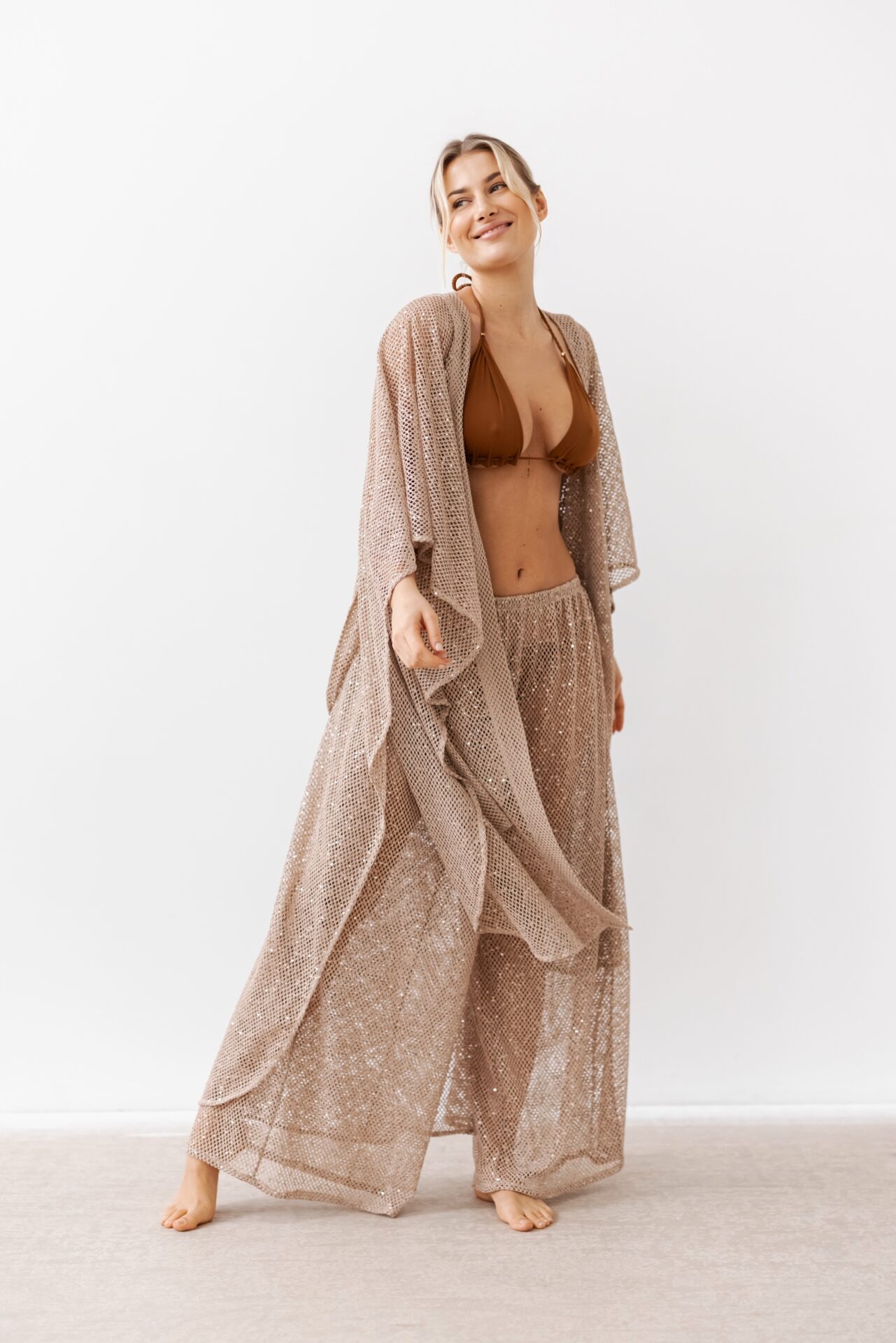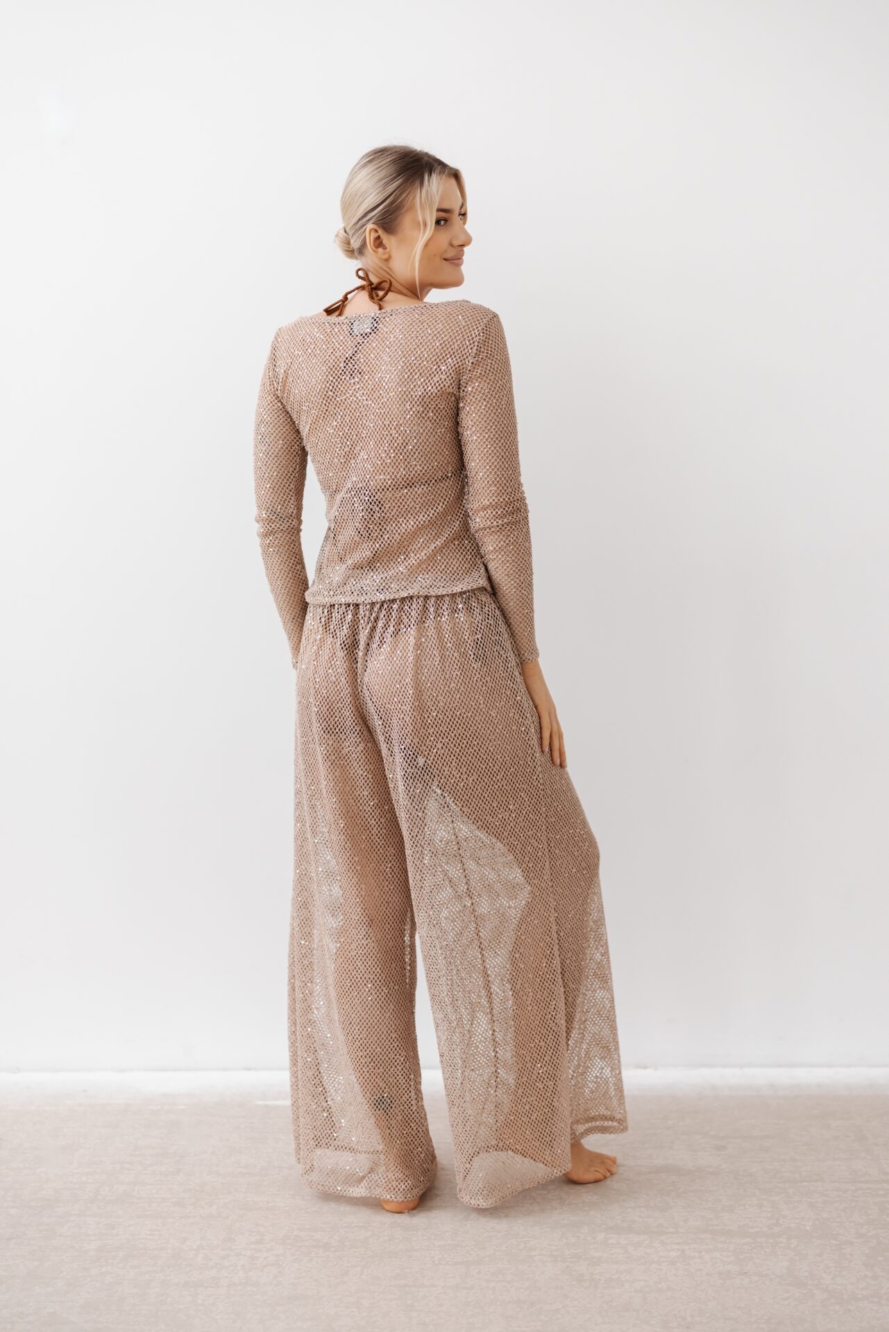 Spodnie Paros Long to długie, szerokie spodnie, które powstały z myślą o powietrzu i świetle. Uszyte z ultralekkiej, ażurowej tkaniny delikatnie otulają sylwetkę, jednocześnie pozwalając jej oddychać i pozostawać w pełnym kontakcie ze słońcem i wiatrem. Ozdobione delikatnymi cekinami w tym samym, ciepłym kolorze beżu sprawiają, że spodnie w swej surowości i prostocie nabierają delikatnego blasku. Spodnie Paros to spodnie typu biodrówki, wykończone elastyczną gumą , nie posiadają podszewki. Przepięknie wyglądają w połączeniu z Kimonem Naksos, czy bluzką na długi rękaw Mykonos, które uszyte są z tej samej tkaniny.
