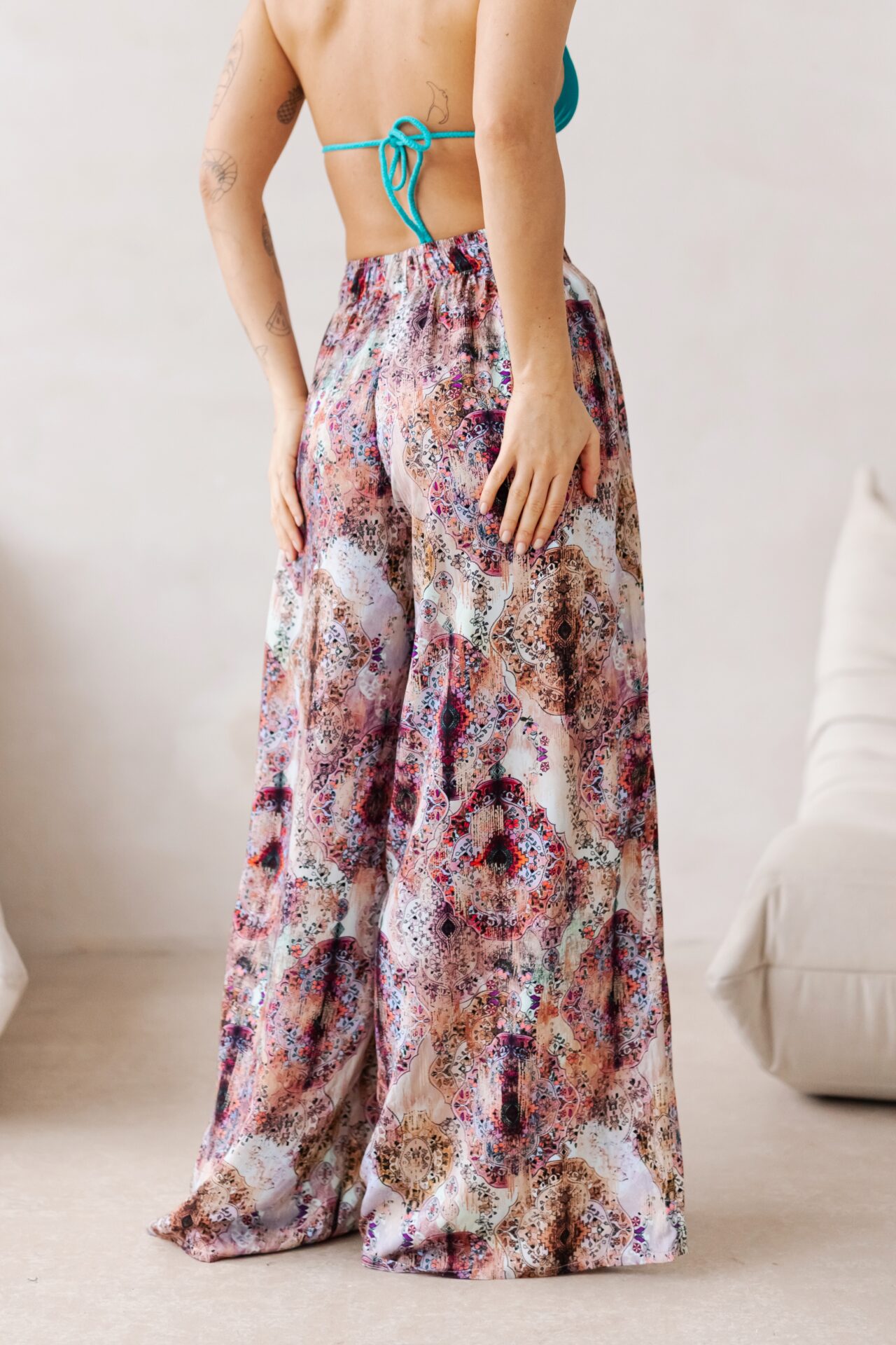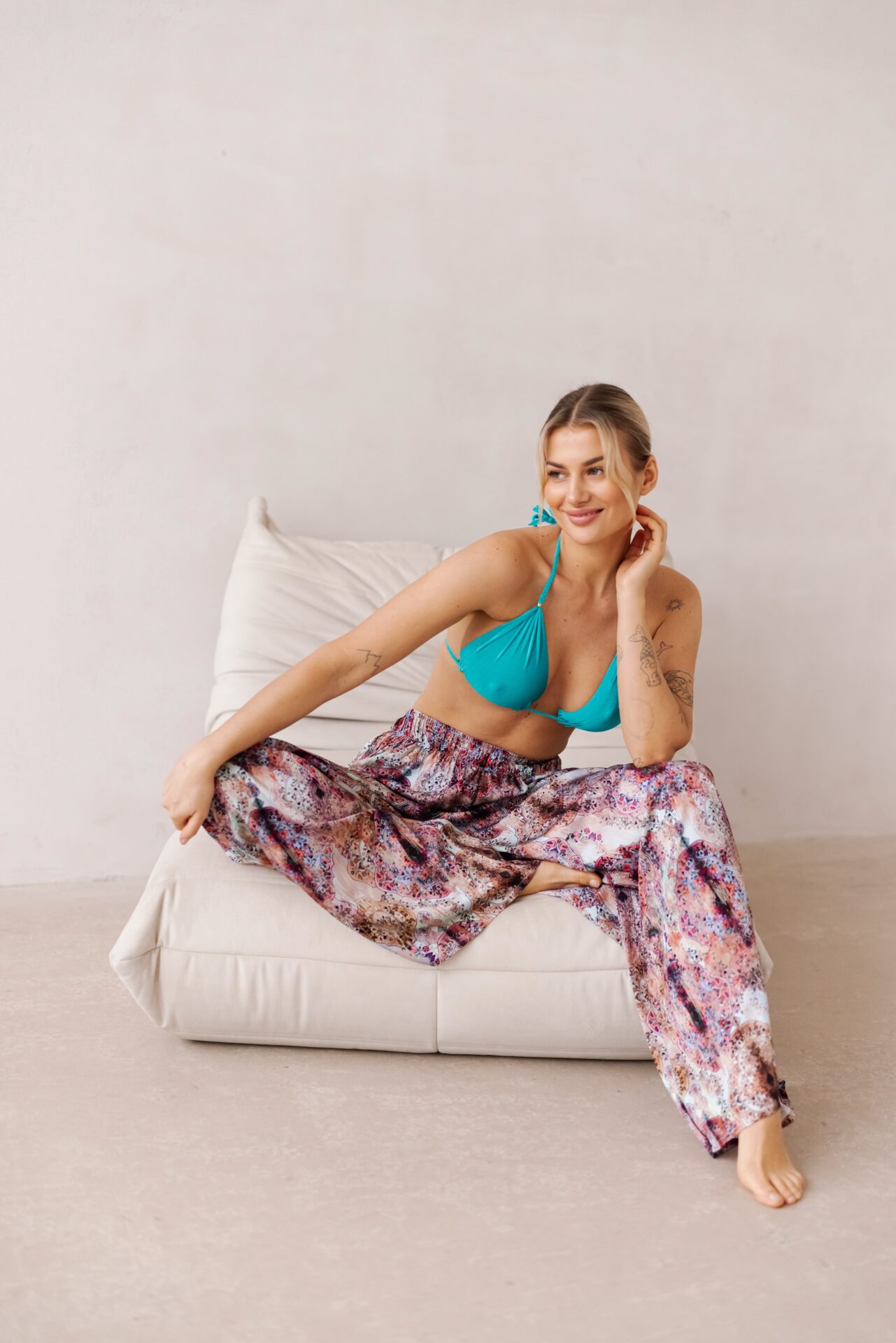 Szerokie, lejące spodnie z kieszeniami to kwintesencja letniej lekkości i elegancji. Wysoki stan oraz szeroka nogawka wydłużają optycznie sylwetkę, elastyczna talia dopasowuje spodnie do różnych typów sylwetki. Pięknie komponują się z bikini, strojami jednoczęściowymi, topami i plażowymi kimonami tworząc luksusowy, resortowy look. Idealne na wakacje, spacery po plaży oraz letnie wyjścia do miasta. Uszyte z najwyższej jakości tkaniny wiskozowej, która jest miękka, przewiewna i delikatna.