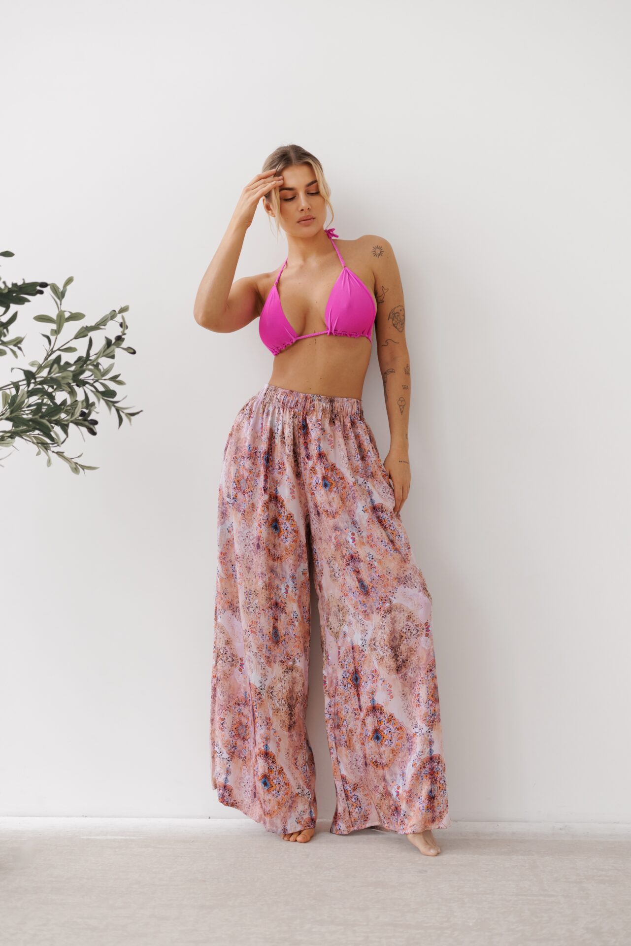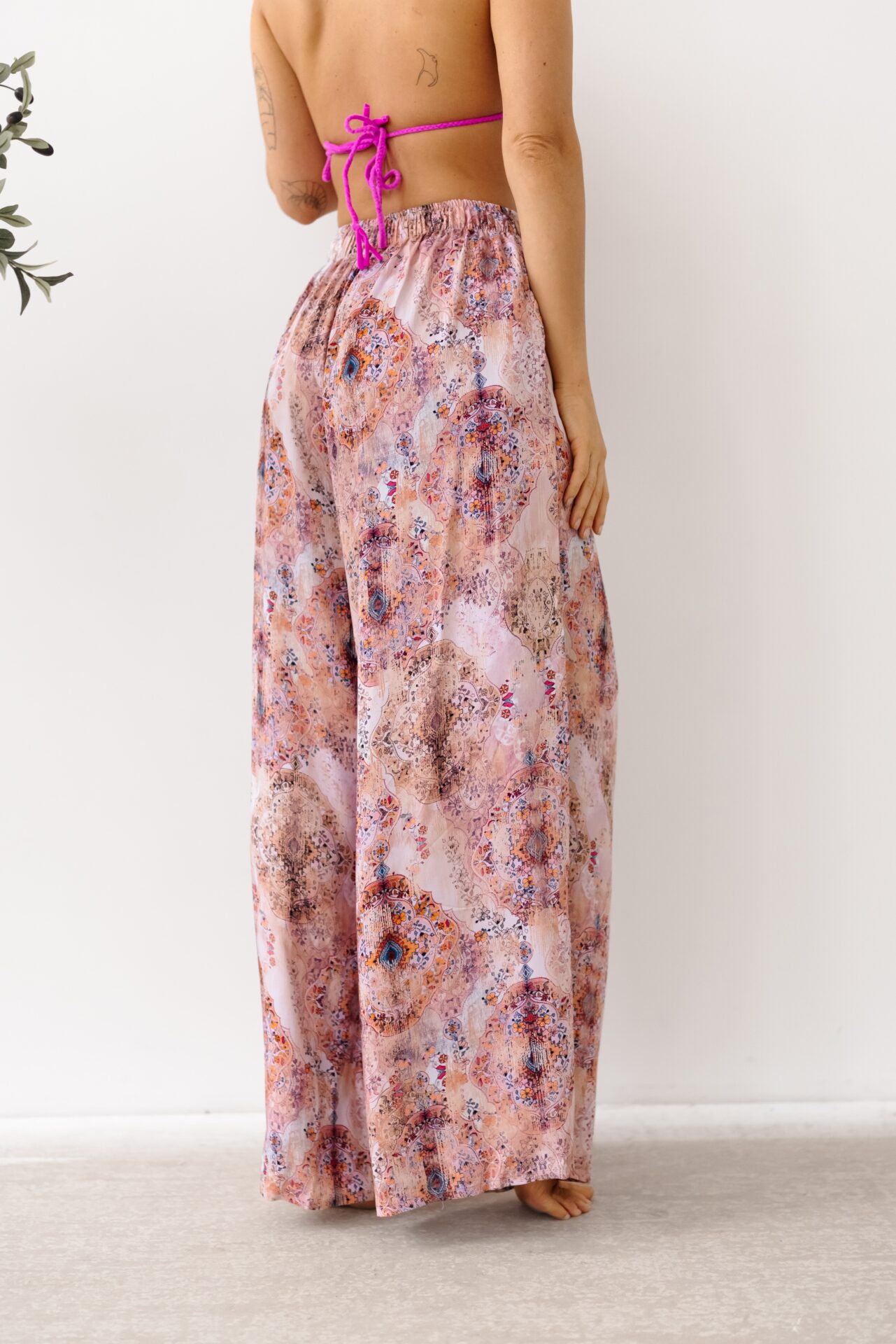 Szerokie, lejące spodnie z kieszeniami to kwintesencja letniej lekkości i elegancji. Wysoki stan oraz szeroka nogawka wydłużają optycznie sylwetkę, elastyczna talia dopasowuje spodnie do różnych typów sylwetki. Pięknie komponują się z bikini, strojami jednoczęściowymi, topami i plażowymi kimonami tworząc luksusowy, resortowy look. Idealne na wakacje, spacery po plaży oraz letnie wyjścia do miasta. Uszyte z najwyższej jakości tkaniny wiskozowej, która jest miękka, przewiewna i delikatna.