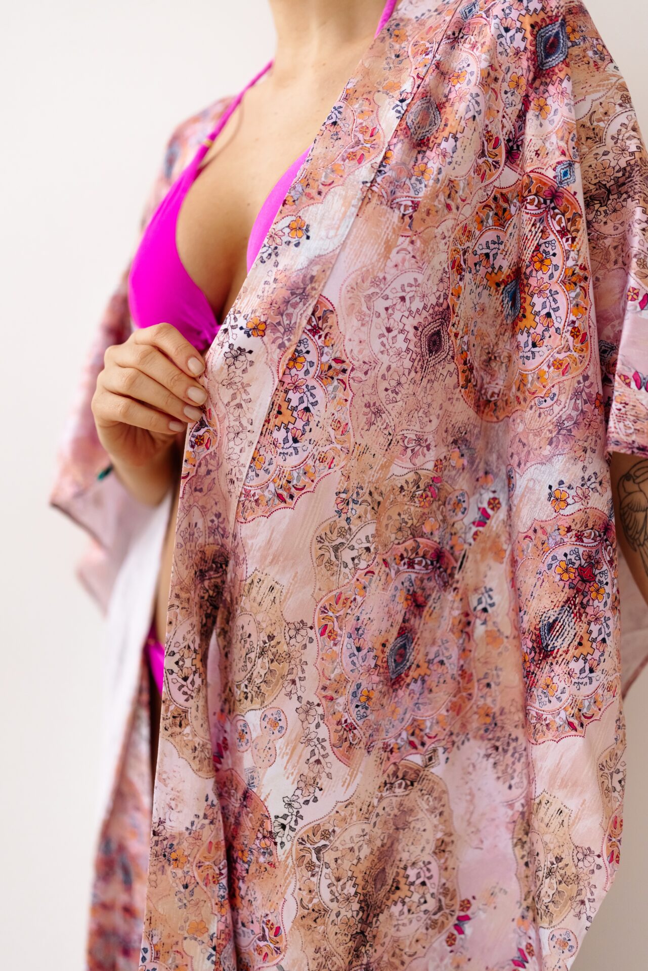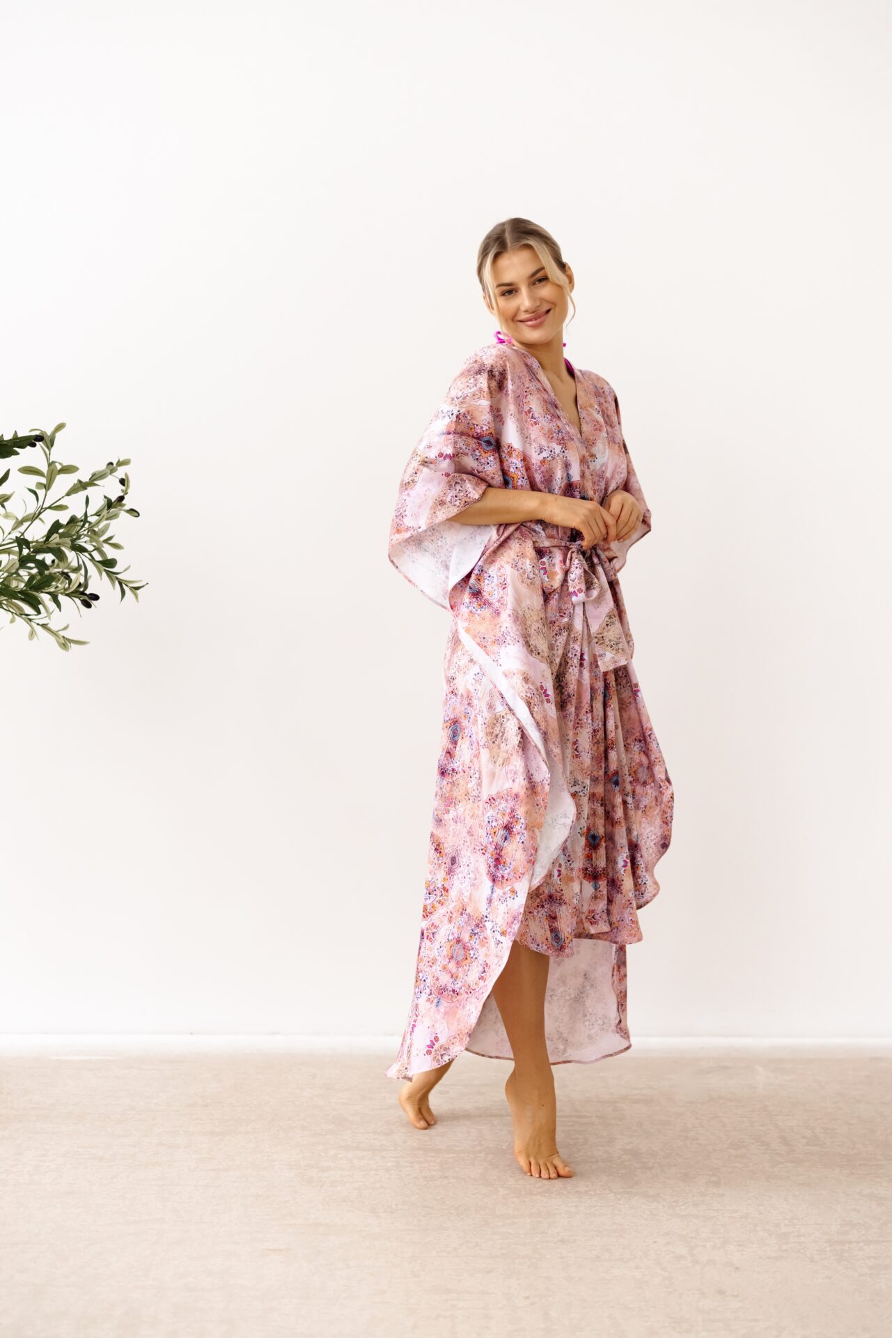 Zwiewne kimono plażowe Procida to połączenie elegancji, oryginalności i komfortu. Doskonale sprawdzi się jako okrycie na bikini czy strój kąpielowy. Kimono o kroju oversize z asymetrycznym dołem uszyte zostało z wysokiej jakości wiskozy. Eteryczne i przewiewne. Idealnie sprawdzi się w plażowych ale również streetwearowych stylizacjach. W połączeniu ze spodniami plażowymi i topem tworzy oryginalny, elegancki, resortowy look.                                                                              W zestawie pasek.